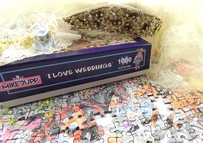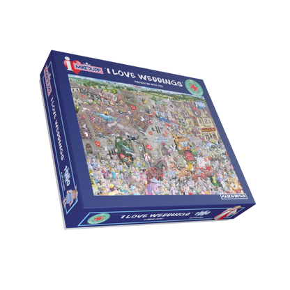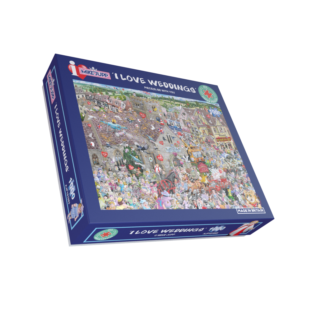 „I Love Weddings“ ist ein wunderbar wildes 1000-teiliges Puzzle aus dem erstaunlichen Kopf von Mike Jupp.