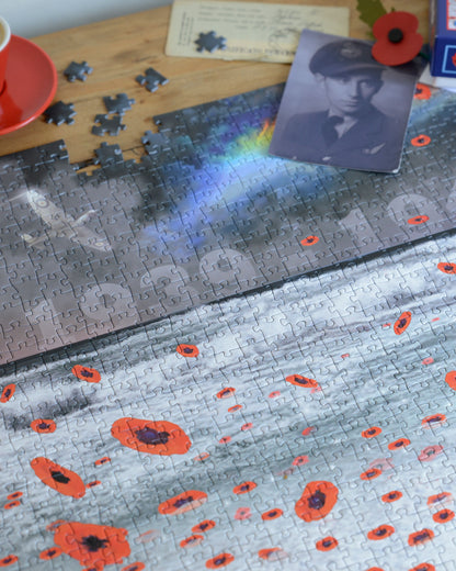This poignant puzzle features a stormy sky above a turbulent sea, with a WW2 aircraft gliding towards a glimmer of hope - a rainbow. Poppies are falling symbolising all those who lost their lives during the dark days of War. The word 'Remember' etched in to the sand, our hearts and memories as a touching tribute for those we have lost. The perfect challenge for War enthusiasts.
