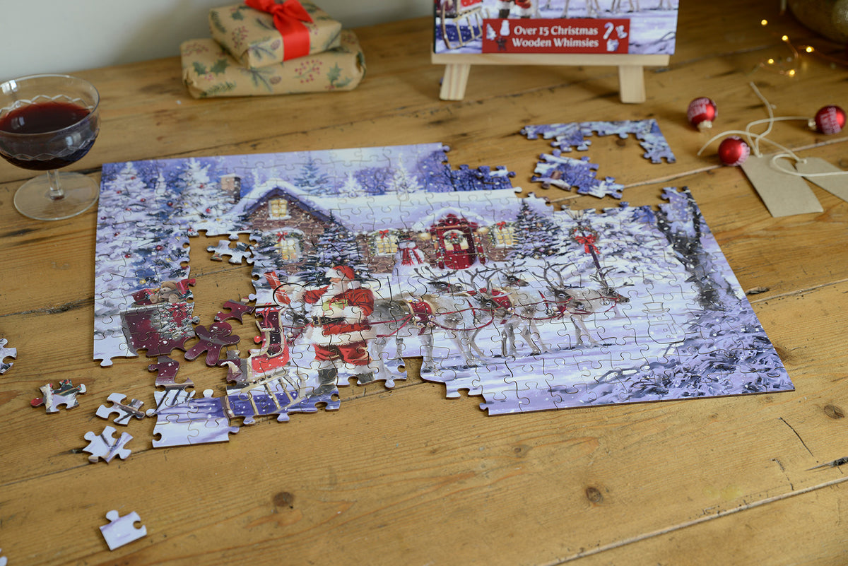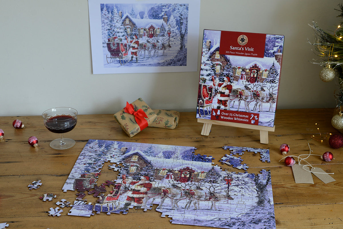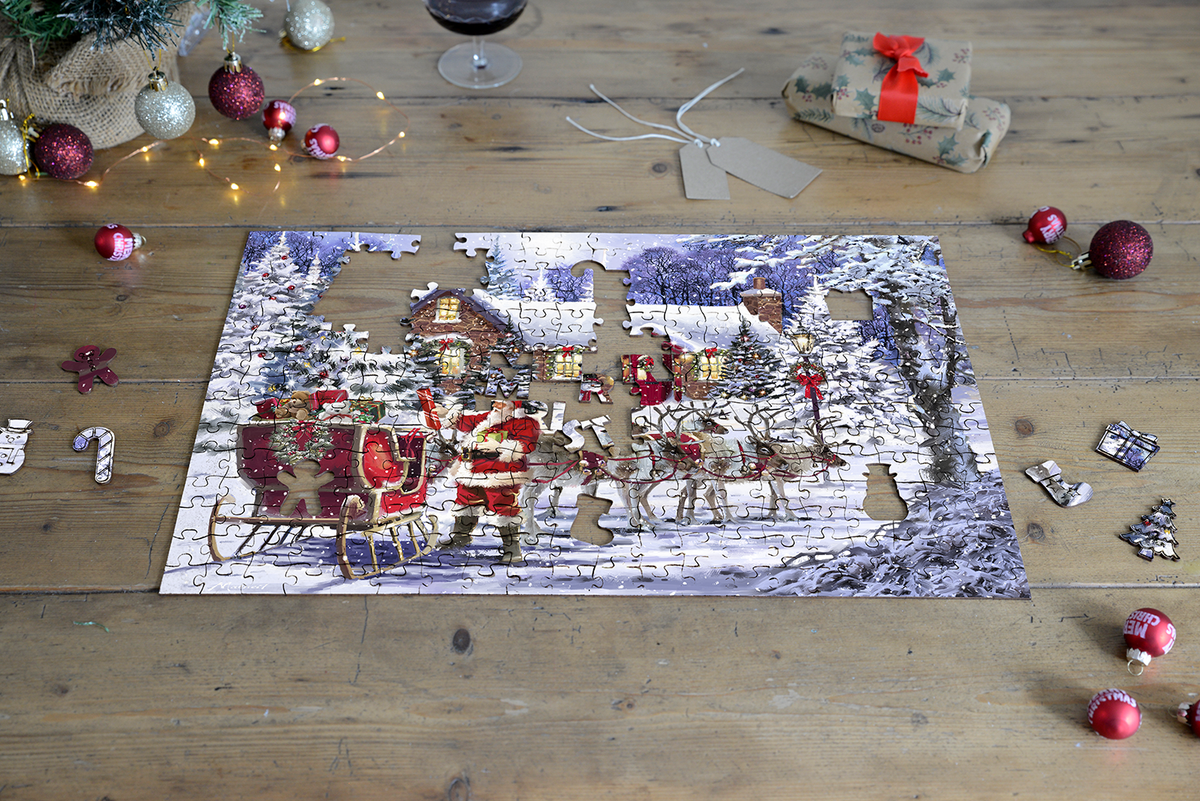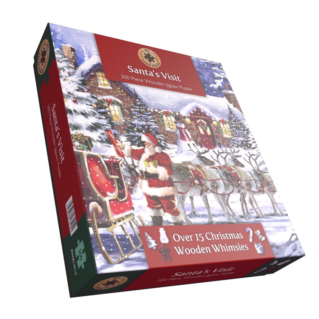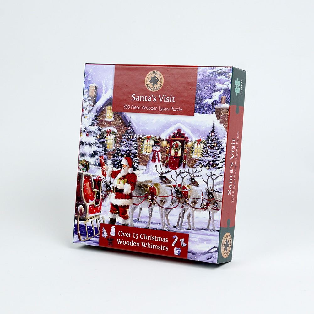 Plongez dans un pays des merveilles hivernal avec ce superbe puzzle en bois de 300 pièces représentant une scène nostalgique « La visite du Père Noël ».