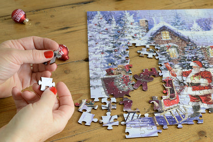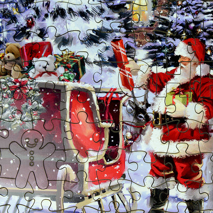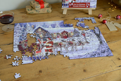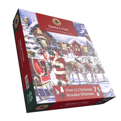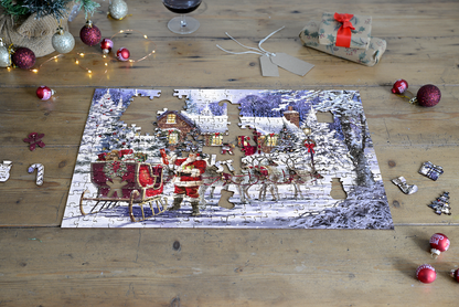 Plongez dans un pays des merveilles hivernal avec ce superbe puzzle en bois de 300 pièces représentant une scène nostalgique « La visite du Père Noël ».