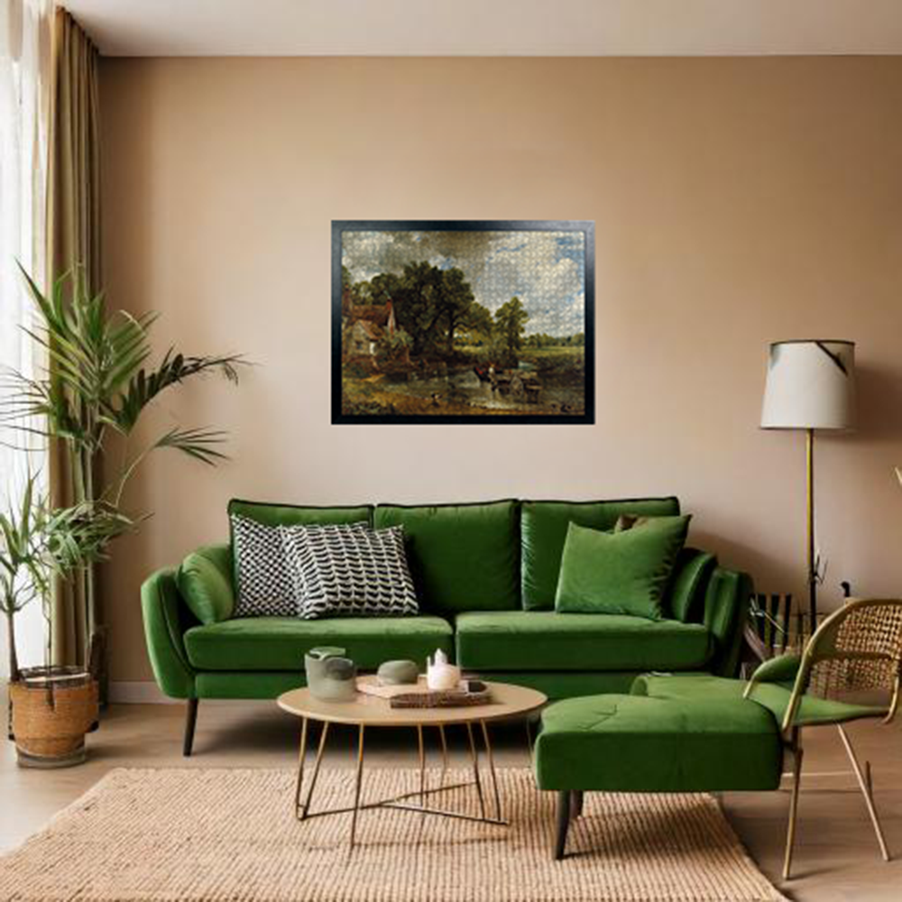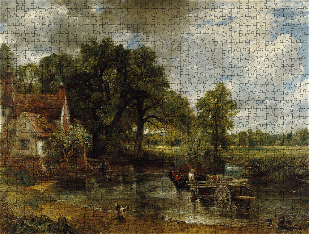 Peint par John Constable et datant de 1821, Le Chariot de Foin représente un site du Suffolk, près de Flatford, sur la rivière Stour. Le chariot de foin est une sorte de charrette tirée par des chevaux, que l'on peut voir dans l'eau sur ce tableau. Les chevaux tirent la charrette à travers l'eau pour atteindre l'autre rive. À gauche, un magnifique cottage recouvert de verdure surplombe le lac, situé derrière le moulin de Flatford. Le cottage et la rivière sont restés très proches de ce qu'ils étaient dans ce tableau de 1821. Un puzzle très paisible et relaxant à reconstituer.