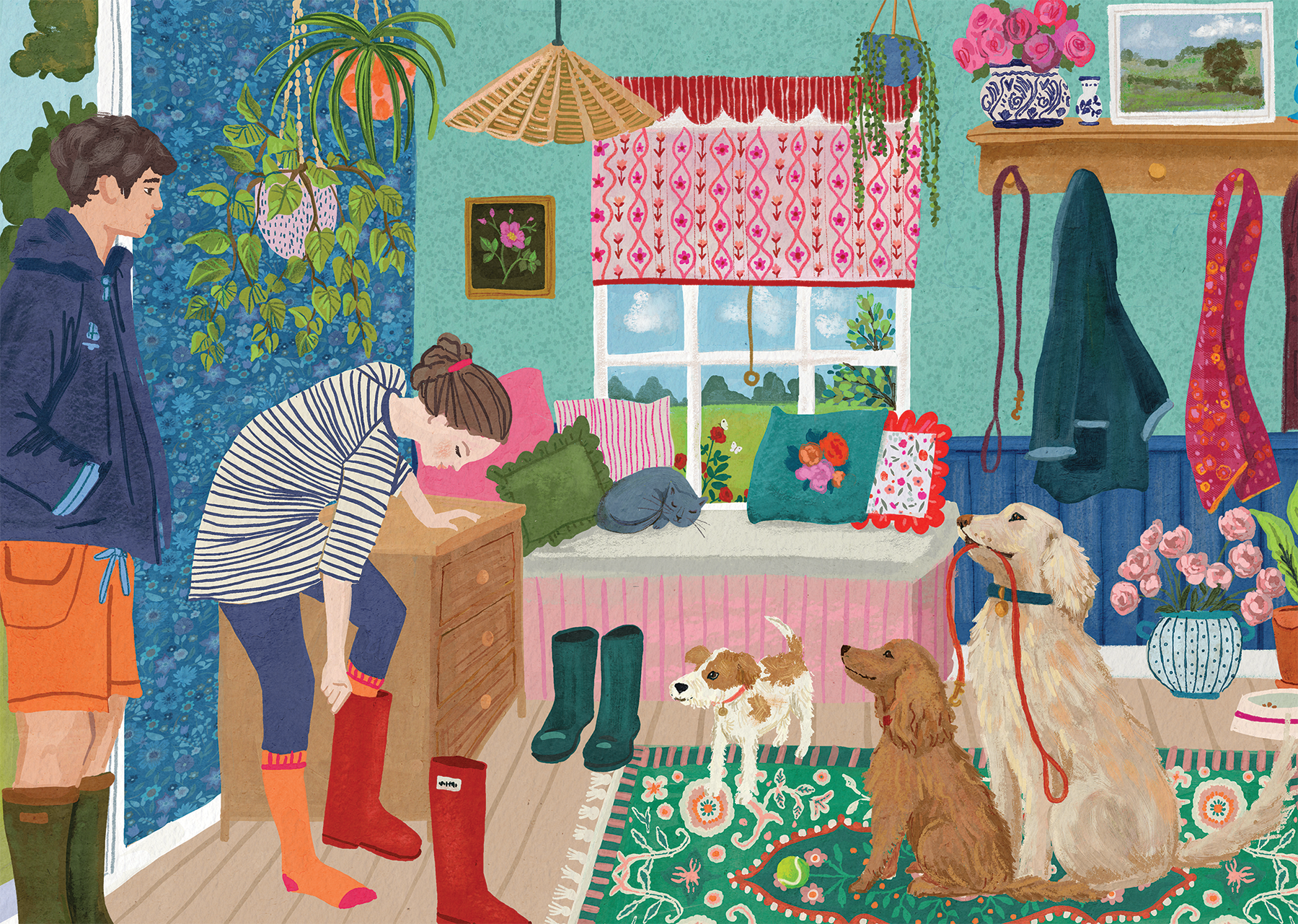 In this cosy, feel-good scene, a couple prepares for a cheerful walk in the fresh air while three over-excited dogs can barely sit still, each one eager to be first out the door. Packed with warmth, humour, and lovable details, it perfectly captures that familiar moment when a simple outing becomes the highlight of the day for everyone involved - especially the dogs!