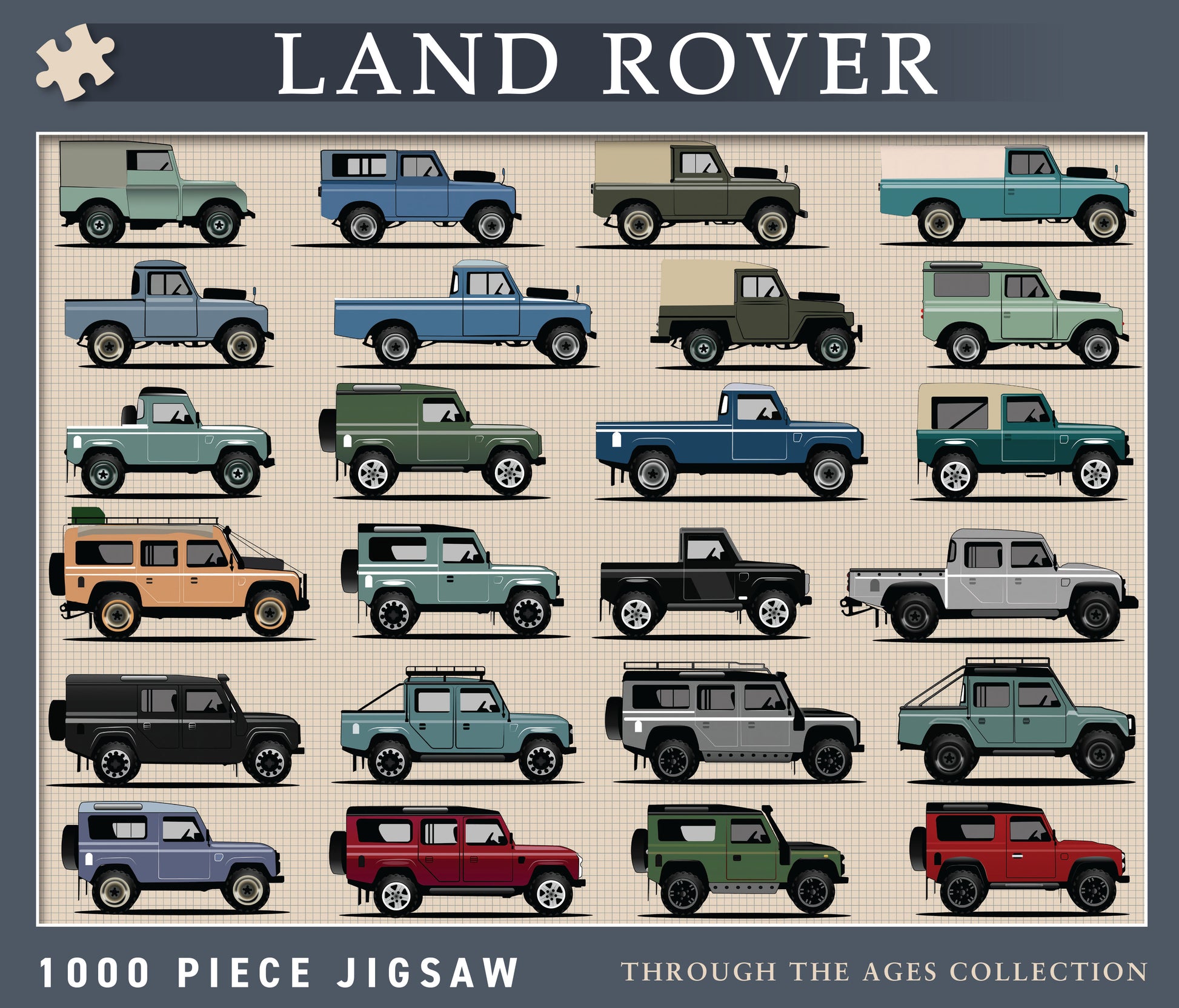 This detailed jigsaw puzzle features 24 beautifully illustrated variants of the classic Land Rover, charting its evolution through the decades. A must-have for Land Rover fans and a rewarding challenge for puzzle lovers of all ages.