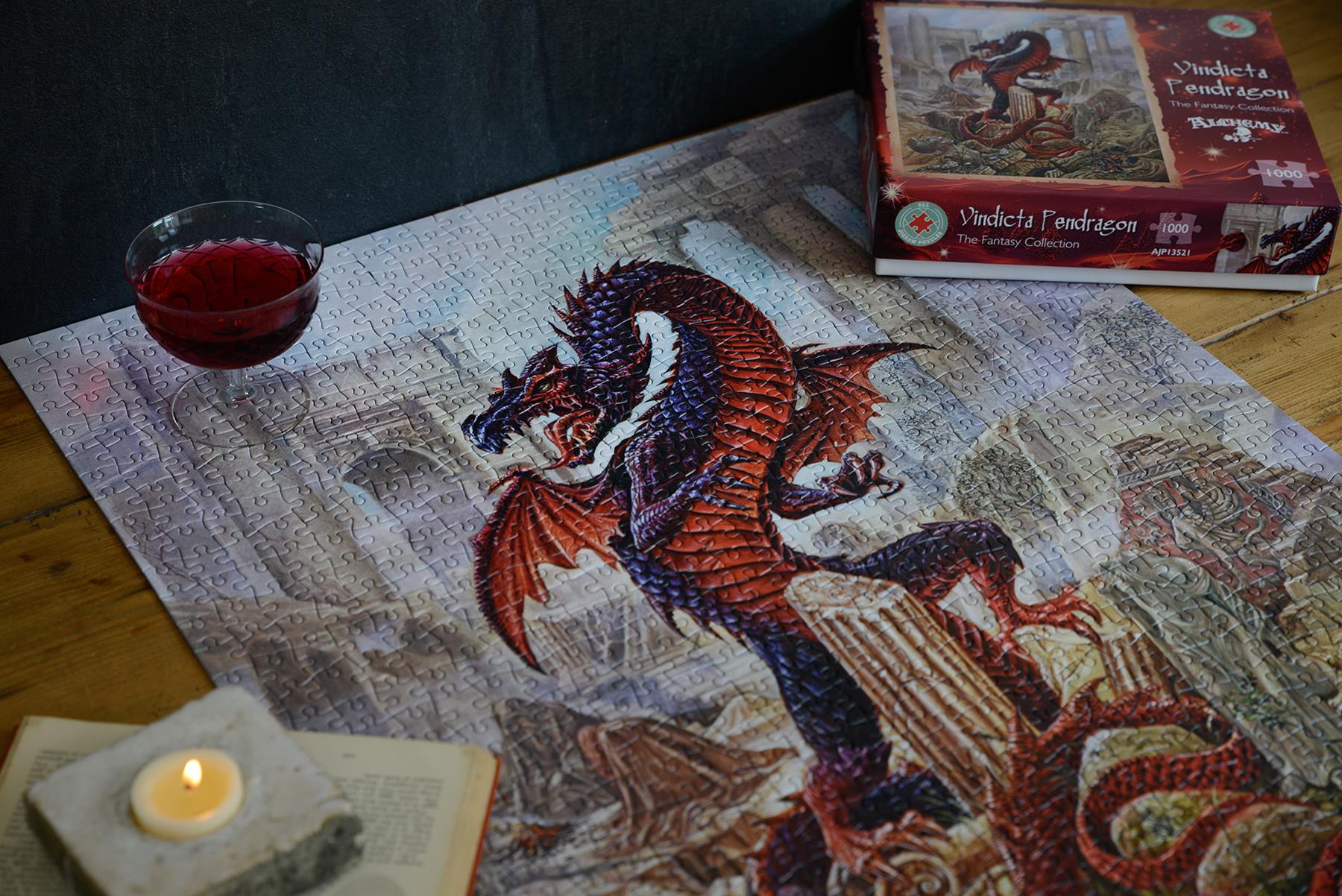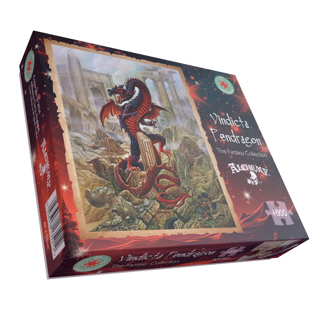 Embark on a whimsical adventure with the Vindicta Pendragon 1000 Piece Jigsaw Puzzle. Piece together a majestic dragon in a mystical ruins setting, evoking a sense of wonder and fantasy.  Transport yourself into this magical realm and unleash your inner dragon with this fantasy jigsaw puzzle! Will you order this puzzle and slay the dragon?